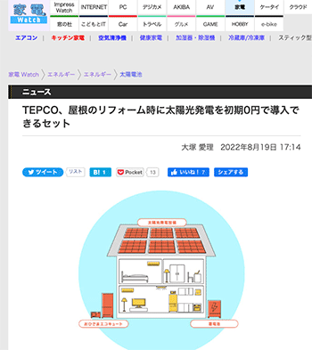 「TEPCO、屋根のリフォーム時に太陽光発電を初期0円で導入できるセット」という東京電力エナジーパートナーの取り組みについて取り上げている記事が、家電 Watchに掲載されています。