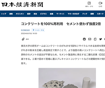 プロダクト・設備「コンクリートを100%再利用 セメント使わず強度2倍」という東京大学の研究チームによる開発について取り上げている記事が、日本経済新聞に掲載されています。