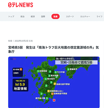 「宮崎県5弱 発生は「南海トラフ巨大地震の想定震源域の外」気象庁」という2日午前0時ごろに起こった宮崎県日南市での震度5弱の地震について取り上げている記事が、日テレNEWSに掲載されています。