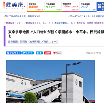 再開発「東京多摩地区で人口増加が続く学園都市・小平市。西武線駅前再開発でタワマン建設も」という東京多摩地区でのまちづくりについて取り上げている記事が、健美家に掲載されています。