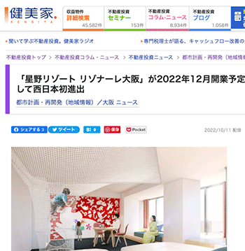 「「星野リゾート リゾナーレ大阪」が2022年12月開業予定! リゾナーレブランドとして西日本初進出」という記事が、健美家に掲載されています。
