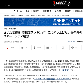 「さいたま市を“幸福度ランキング”1位に押し上げた、10年来のスマートシティ構想」という記事が、ITmedia ビジネスオンラインに掲載されています。