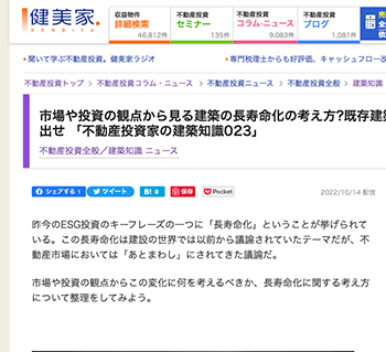 「市場や投資の観点から見る建築の長寿命化の考え方?既存建築から新しい価値を生み出せ 「不動産投資家の建築知識023」」という新堀学氏による記事が、健美家に掲載されています。