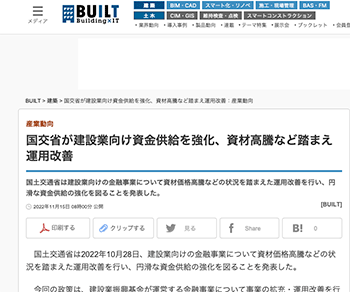 まちづくり「国交省が建設業向け資金供給を強化、資材高騰など踏まえ運用改善」という国土交通省の取り組みについて取り上げている記事が、BUILTに掲載されています。