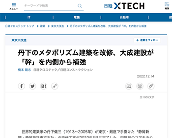リノベーション・空間再生「丹下のメタボリズム建築を改修、大成建設が「幹」を内側から補強」という大成建設の取り組みについて取り上げている記事が、日経クロステックに掲載されています。