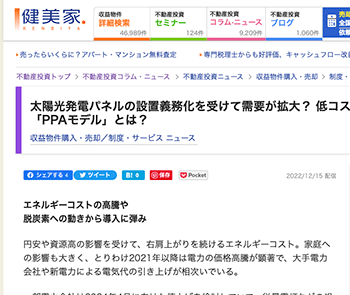 「太陽光発電パネルの設置義務化を受けて需要が拡大? 低コストで設備を導入する「PPAモデル」とは?」という記事が、健美家に掲載されています。