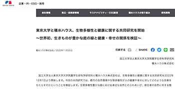 →『東京大学と積水ハウス、生物多様性と健康に関する共同研究を開始 』