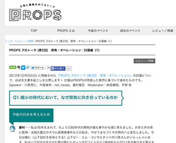2012年12月9日(日) に東京で開催された「PROPS プロトーク [第2回] 開発・オペレーション」の討議についての、ほぼ全文書き起こしのレポート記事が公開されたそうです。