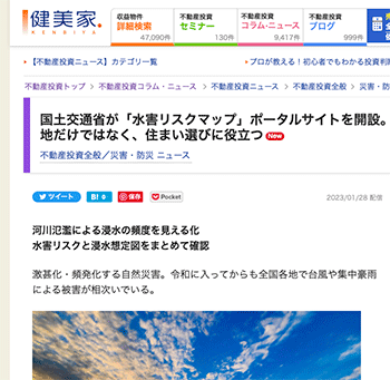 「国土交通省が「水害リスクマップ」ポータルサイトを開設。防災まちづくりや企業立地だけではなく、住まい選びに役立つ」という国道交通省の取り組みについて取り上げている記事が、健美家に掲載されています。
