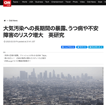 ジャーナル「大気汚染への長期間の暴露、うつ病や不安障害のリスク増大 英研究」という記事が、CNN.co.jpに掲載されています。