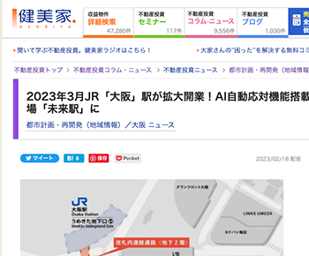 まちづくり「2023年3月JR「大阪」駅が拡大開業!AI自動応対機能搭載のイノベーションの実験場「未来駅」に」というJR西日本の取り組みについて取り上げている記事が、健美家に掲載されています。