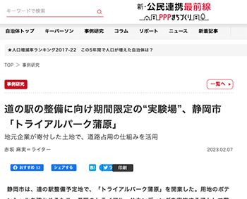 「道の駅の整備に向け期間限定の“実験場”、静岡市「トライアルパーク蒲原」」という「トライアルパーク蒲原」について取り上げている記事が、新・公民連携最前線|PPPまちづくりに掲載されています。