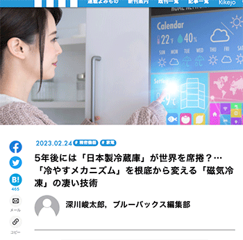 「5年後には「日本製冷蔵庫」が世界を席捲?…「冷やすメカニズム」を根底から変える「磁気冷凍」の凄い技術」という記事が、ブルーバックス | 講談社に掲載されています。