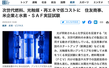 →『次世代燃料、光触媒・再エネで低コストに 住友商事、米企業と水素・SAF実証試験』