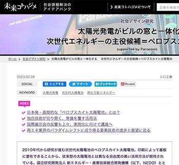 プロダクト・設備「太陽光発電がビルの窓と一体化する 次世代エネルギーの主役候補=ペロブスカイト太陽電池」という記事が未来コトハジメに掲載されています。