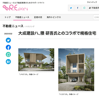 「大成建設ハ、隈 研吾氏とのコラボで規格住宅」という大成建設ハウジングによる建築家・隈研吾氏とのコラボレーションによる規格住宅「モクコンの家」について取り上げている記事がR.E.portに掲載されています。