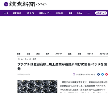「プチプチは登録商標…川上産業が避難所向けに簡易ベッドを開発」という川上産業の取り組みについて取り上げている記事が、 読売新聞に掲載されています。