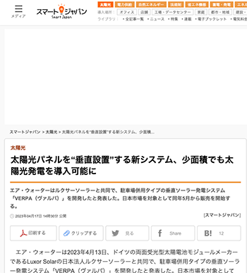 「太陽光パネルを“垂直設置”する新システム、少面積でも太陽光発電を導入可能に」というエア・ウォーターとルクサーソーラーによる垂直ソーラー発電システム「VERPA(ヴァルパ)」について取り上げている記事が、スマートジャパンに掲載されています。