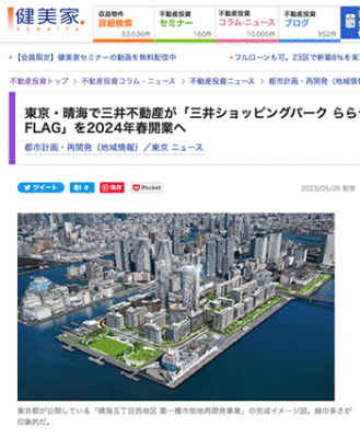 「東京・晴海で三井不動産が「三井ショッピングパーク ららテラス HARUMI FLAG」を2024年春開業へ」という「三井ショッピングパーク ららテラス HARUMI FLAG」について取り上げている記事が、健美家に掲載されています。
