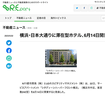 「横浜・日本大通りに滞在型ホテル、6月14日開業」というNTT都市開発とUDホスピタリティマネジメントによるサービスアパートメント「シタディーンハーバーフロント横浜」について取り上げている記事が、R.E.portに掲載されています。