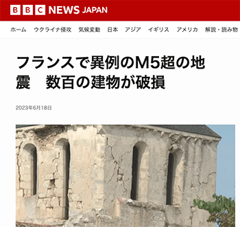 「フランスで異例のM5超の地震 数百の建物が破損」というフランス西部での地震について取り上げている記事が、BBCニュースに掲載されています。