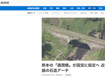 「熊本の「通潤橋」が国宝に指定へ 近世最大級の石造アーチ」という熊本県にある「通潤橋」が、国宝に指定されることになったことなどを伝えている記事が、NHKに掲載されています。