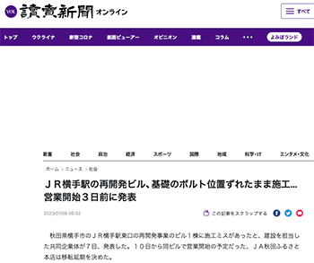 「JR横手駅の再開発ビル、基礎のボルト位置ずれたまま施工…営業開始3日前に発表」という記事が、読売新聞に掲載されています。