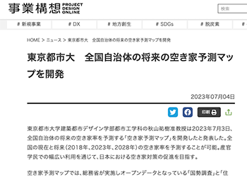 「東京都市大 全国自治体の将来の空き家予測マップを開発」という秋山祐樹准教授の取り組みについて取り上げているという記事が、事業構想オンラインに掲載されています。