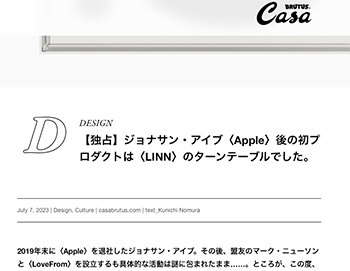 製品「【独占】ジョナサン・アイブ〈Apple〉後の初プロダクトは〈LINN〉のターンテーブルでした。」といスコットランドのオーディオ・ブランド〈LINN〉のターンテーブルについて取り上げているという記事が、Casa BRUTUSに掲載されています
