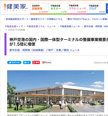 「神戸空港の国内・国際一体型ターミナルの整備事業概要が決定!2025年には発着便が1.5倍に増便」という神戸空港の取り組みについて取り上げているという記事が、健美家に掲載されています