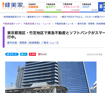 再開発「東京都港区・竹芝地区で東急不動産とソフトバンクがスマートシティプロジェクト進行中。」というSmart City Takeshibaでの取り組みについて取り上げているという記事が、健美家に掲載されています