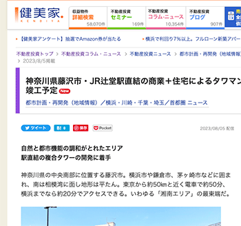 「神奈川県藤沢市・JR辻堂駅直結の商業+住宅によるタワマンが整備。2025年12月竣工予定」という「(仮称)辻堂第二計画」の開発事業について取り上げているという記事が、健美家に掲載されています