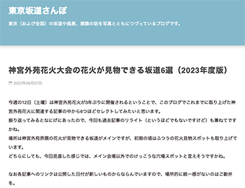 「神宮外苑花火大会の花火が見物できる坂道6選(2023年度版)」という記事が、東京坂道さんぽに掲載されています。