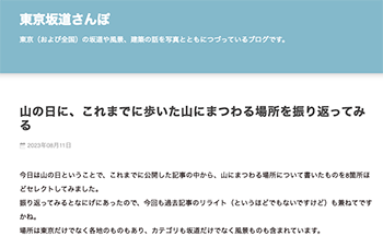 「山の日に、これまでに歩いた山にまつわる場所を振り返ってみる」という記事が、東京坂道さんぽに掲載されています。