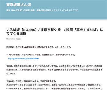 PR「いろは坂【NO.296】/ 多摩市桜ケ丘 / 映画「耳をすませば」にでてくる坂道」という記事が、東京坂道さんぽに掲載されています。