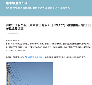 PR「岡本三丁目の坂(東京富士見坂)【NO.257】/世田谷区 /富士山が見える坂道」という記事が、東京坂道さんぽに掲載されています。