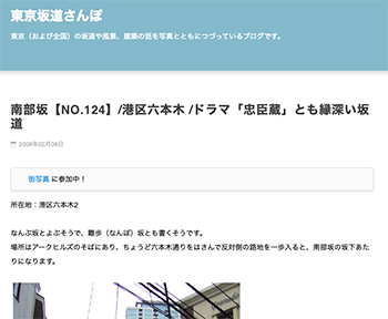 「南部坂【NO.124】/港区赤坂+六本木 /ドラマ「忠臣蔵」とも縁深い坂道」という記事が、東京坂道さんぽに掲載されています。