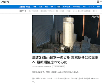 「高さ385m日本一のビル 東京駅そばに誕生へ 最新順位比べてみた」という●●の取り組み「トーチタワー」について取り上げている記事が、NHKに掲載されています