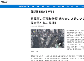 再開発「秋葉原の再開発計画 地権者の3分の2以上同意得られる見通し」という動画ニュースが、NHKにて公開されています。