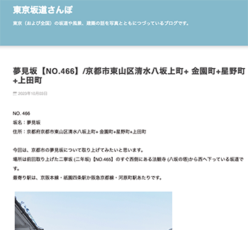 「夢見坂【NO.466】/京都市東山区清水八坂上町+ 金園町+星野町+上田町」という記事が、東京坂道さんぽに掲載されています。
