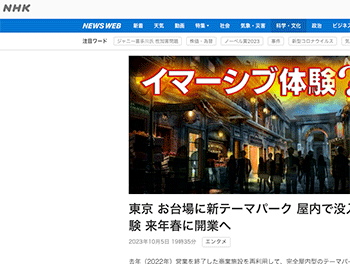 「東京 お台場に新テーマパーク 屋内で没入体験 来年春に開業へ」という記事が、NHKにて公開されています。