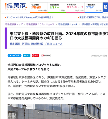 再開発「東武東上線・池袋駅の改良計画。2024年度の都市計画決定を目指し事業を推進、西口の大規模再開発のカギを握る」という東武鉄道の取り組みについて取り上げている記事が、健美家に掲載されています