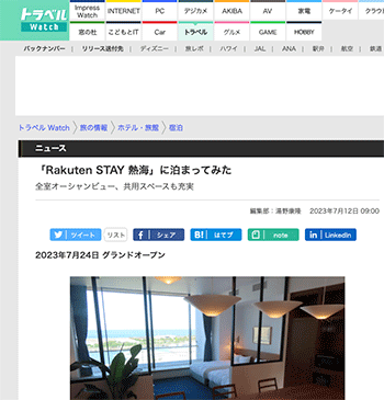 「「Rakuten STAY 熱海」に泊まってみた 全室オーシャンビュー、共用スペースも充実」という記事が、トラベル Watchに掲載されています