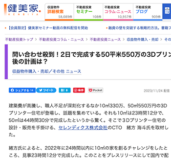 「問い合わせ殺到!2日で完成する50平米550万の3Dプリンター住宅。賃貸住宅や今後の計画は?」というセレンディクスの取り組みについて取り上げている記事が、健美家に掲載されています