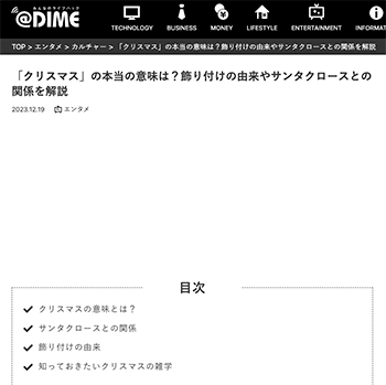 「「クリスマス」の本当の意味は?飾り付けの由来やサンタクロースとの関係を解説」という記事が、@DIME に掲載されています
