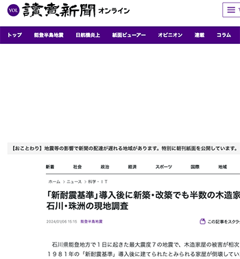 「「新耐震基準」導入後に新築・改築でも半数の木造家屋が「全壊」に…石川・珠洲の現地調査」という能登半島地震について取り上げている記事が、読売新聞に掲載されています