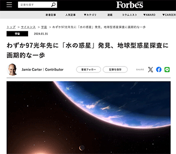 プロダクト・設備「わずか97光年先に「水の惑星」発見、地球型惑星探査に画期的な一歩」という記事が、Forbes JAPANに掲載されています