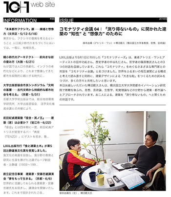 特集:アトリエ・ワン『コモナリティーズ──ふるまいの生産』、その建築的 “知性” と “想像力”のページにて、塚本由晴氏(アトリエ・ワン)と榑沼範久氏(横浜国立大学准教授、思想、芸術論)による対談記事「コモナリティ会議 04:「測り得ないもの」に開かれた建築の “知性” と “想像力” のために」が掲載されています。