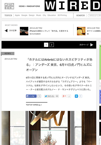 6月11日に虎ノ門ヒルズ内にオープンしたアンダーズ東京について、デザイナーのトニー・チーと総支配人のアルノー・ド・サン=テグジュペリにインタビューした記事がWIRED.jpに掲載されています。