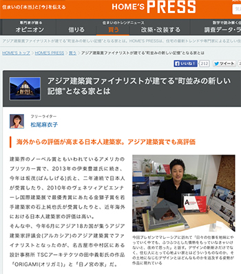 アジア18カ国が集うアジア建築家評議会(アルカシア)のアジア建築賞でファイナリストとなった、TSCアーキテクツの田中義彰氏の作品「ORIGAMI(オリガミ)」と「日ノ宮の家」を紹介した記事がHOME’S PRESSに掲載されています。